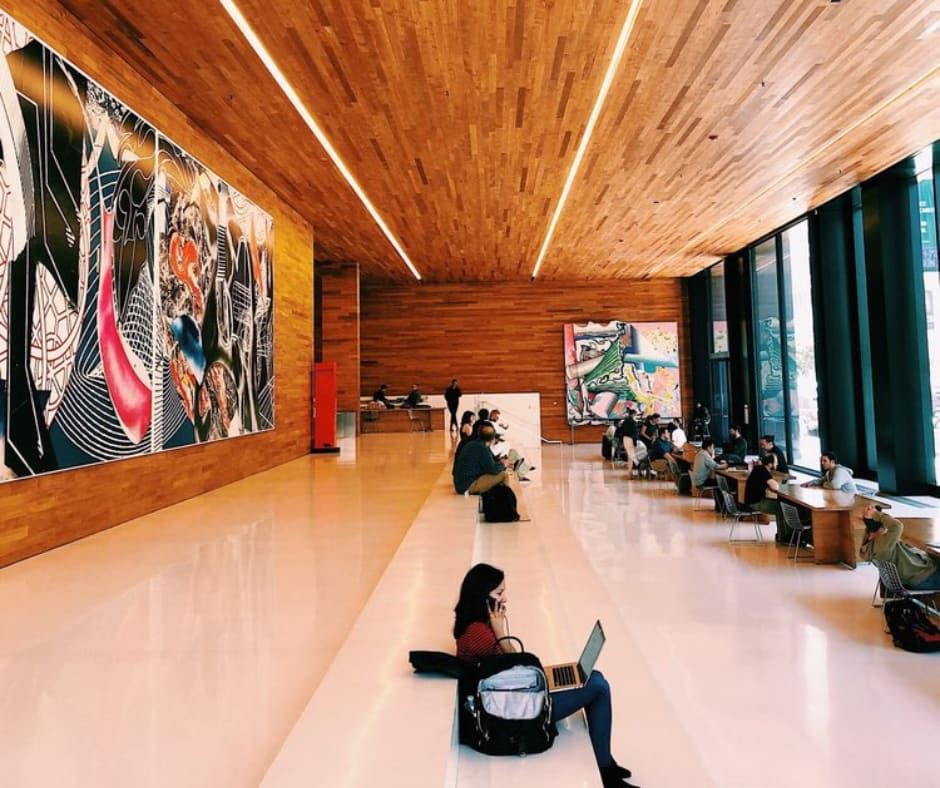 This one is probably one of the POPOS you have seen before without knowing it was one. It hosts a vast indoor space directly accessible from Equator Cafe, situated on the ground level of the LinkedIn office building. While greenery may be absent, the sleek ambiance is characterized by wooden walls and ceilings, abundant natural light, abstract artwork, and large tables for seating. Complementing the space is the added convenience of free WiFi, which is perfect to go work remotely during a weekday.