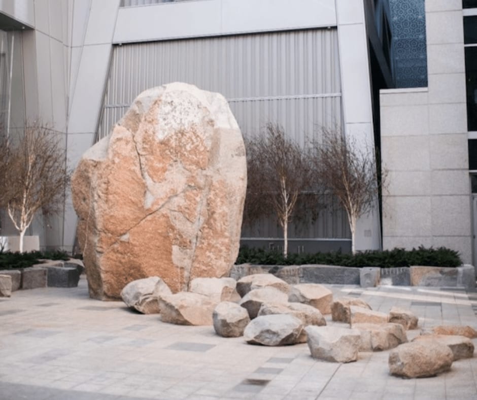 Sculptor Paul Kos and poet Robert Hass joined forces to craft an urban garden seamlessly blending art and landscape. What is worth noting is the striking rock landscaping, which includes an 86-ton boulder serving as both artwork and canvas for Hass's engraved poems. Additionally, a fountain adds a soothing ambiance reminiscent of the rhythmic ticking of a clock.